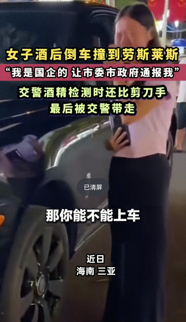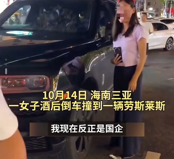 海南三亚一女子,喝酒后倒车时撞上劳斯莱斯,视频中,女子从车上下来后,可能意识到了自己酒驾,怕被处分,情绪非常激动,捂着脸边哭边说"我告诉你,我也不是这个样子的,我也不喜欢在三亚这个样子啊!"