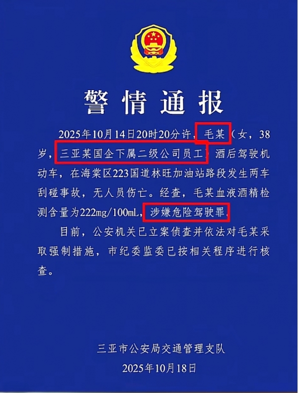 对于这事,当地警方作出通报了,通报称,毛某(38岁),是三亚某国企下属二级公司员工,涉嫌危险驾驶罪,已经对其采取强制措施。
