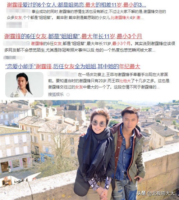 据了解,谢霆锋的情史颇为丰富,有意思的是,谢霆锋交往过的女人,个个都是"姐姐辈",年纪全比他大,最大和他相差11岁,最小的也要大他三个月,谢霆锋的现女友王菲就是大了他整整11岁。