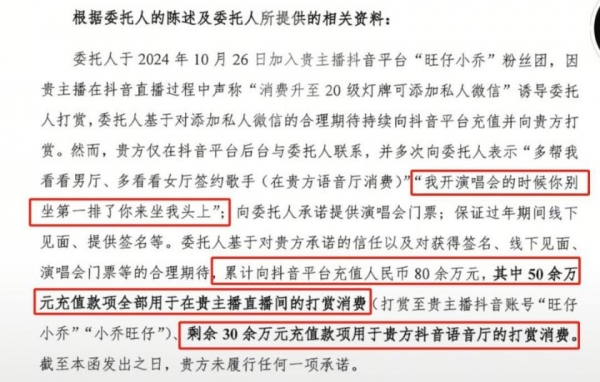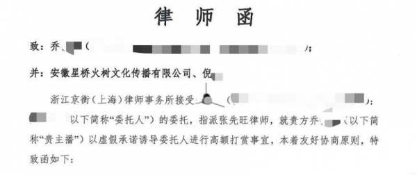 一位博主发布律师函,称自己曾通过各种渠道打赏旺仔小乔80万。