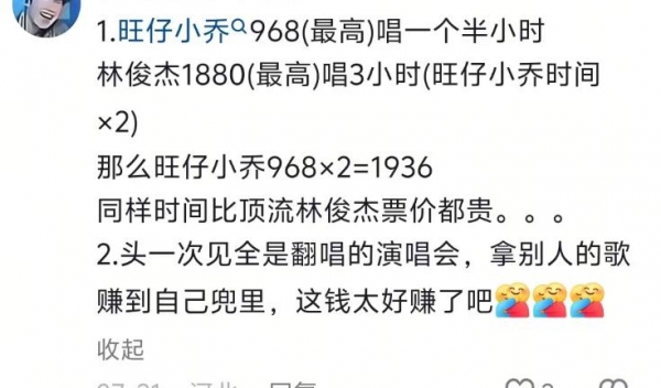有网友算了她一小时的演唱会单价,发现竟然不输给林俊杰这样的国际歌手,这让不少网友产生了逆反的心态。