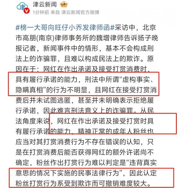 因为根据律师的解读,直播打赏通常是自愿行为,对于打赏后能不能满足承诺,本就是不确定的。