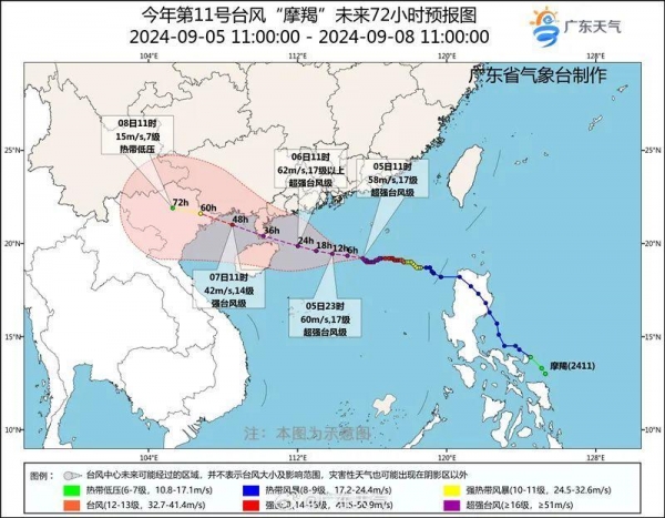 预计5日夜间到6日凌晨,"摩羯"在逼近海南岛的同时强度也将进一步升至62米/秒,并将以超强台风(16~17级,52~58米/秒)的鼎盛期强度于6日下午至夜间在海南琼海到广东电白一带沿海登陆。