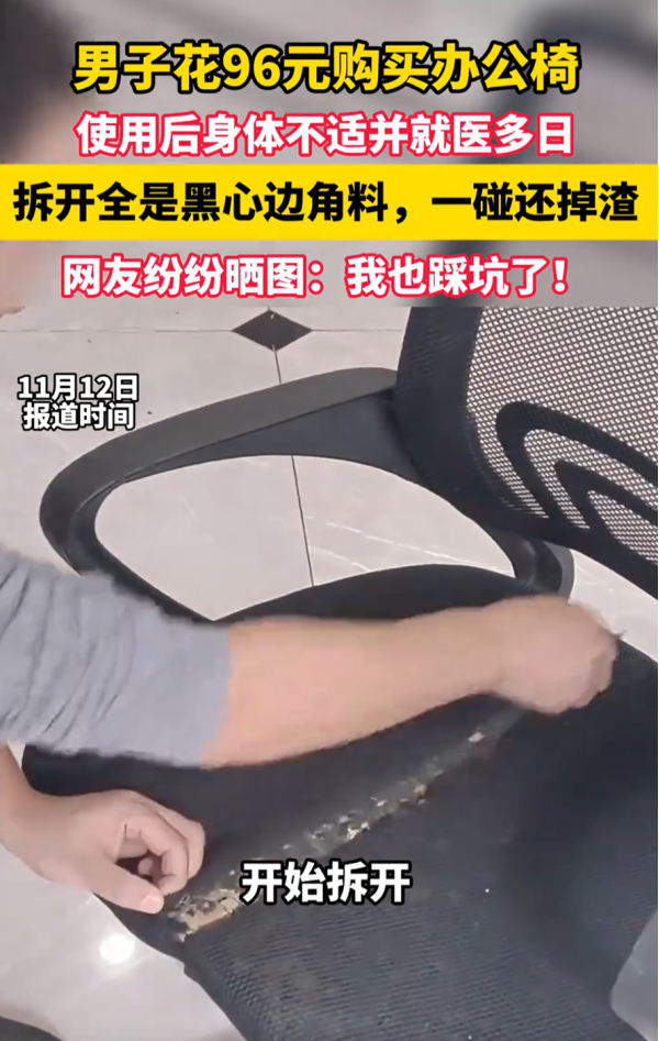 可打了一周的点滴,身体一直不见好,这让他有些奇怪,到家后拆开办公椅,发现座椅其实就是用各种胶水把各种边角料粘到了一起,甚至一碰都掉渣,而他就是在这样的座椅上一坐坐了几个月