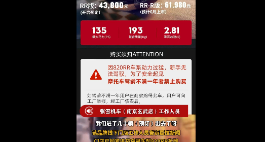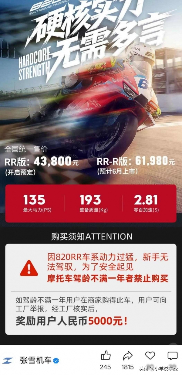 这家2024年成立的公司用创始人的名字命名,主要做仿赛摩托车,首款500RR在2025年卖得不错,新款820RR零百加速2.81秒,马力135匹,被人叫作猛兽,3月21日预售时,公司在海报上写清楚,驾龄不到一年的人不能买,要是有人违规买了,举报了能拿5000块奖励。