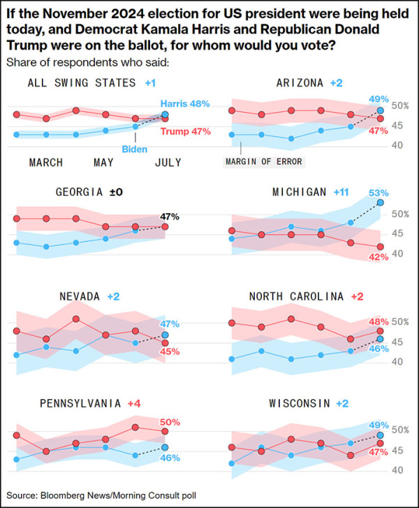 与此同时,彭博社/晨间咨询30日公布(24日-28日调查)的对注册选民的民意调查显示,哈里斯在七个"摇摆州"中的六个击败了特朗普。其中,哈里斯优势最大的是在密歇根州,领先11个百分点。而在亚利桑那州、威斯康星州和内华达州,她领先特朗普2个百分点。