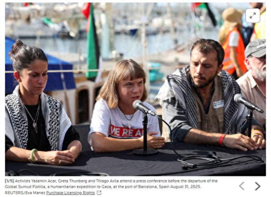 此前,9月1日,据环球网,外媒消息称,当地时间8月31日,瑞典"环保少女"格蕾塔·通贝里与同伴从西班牙巴塞罗那启航再次前往加沙。