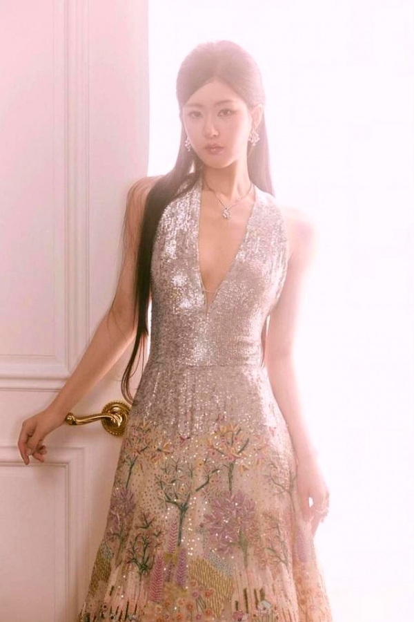 在另一套造型中,赵露思选择了直发搭配深V领礼裙。