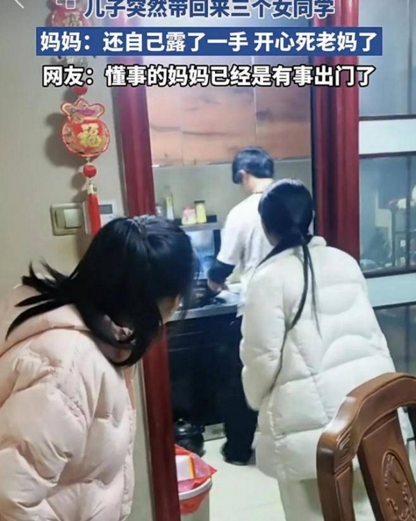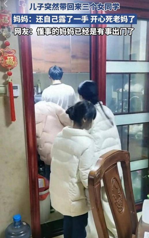 江西,2月21日。一个普通的家庭,妈妈出门前,儿子却带回了三个女同学。对,这不是电视剧里的剧情,而是眼下很多家庭里,真实发生的事情。儿子主动邀请了几个住校的同学来家里玩。没想到,这三个小伙伴全是女生。也许是想尽快消磨时间,三个女生一进门,嘴巴甜得很:"阿姨好!"气氛一下子就温馨了。