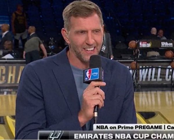 直播吧12月17日讯 NBA杯决赛,马刺vs尼克斯。诺维茨基担任现场解说嘉宾。