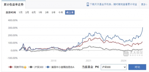 他掌管的另一个产品富国通胀通缩主题轮动混合(A:100039,C:015692)甚至更猛,从他2019年掌管以来大涨了275.33%,任职年化收益率超22%,完全跑赢业绩基准和同类产品。