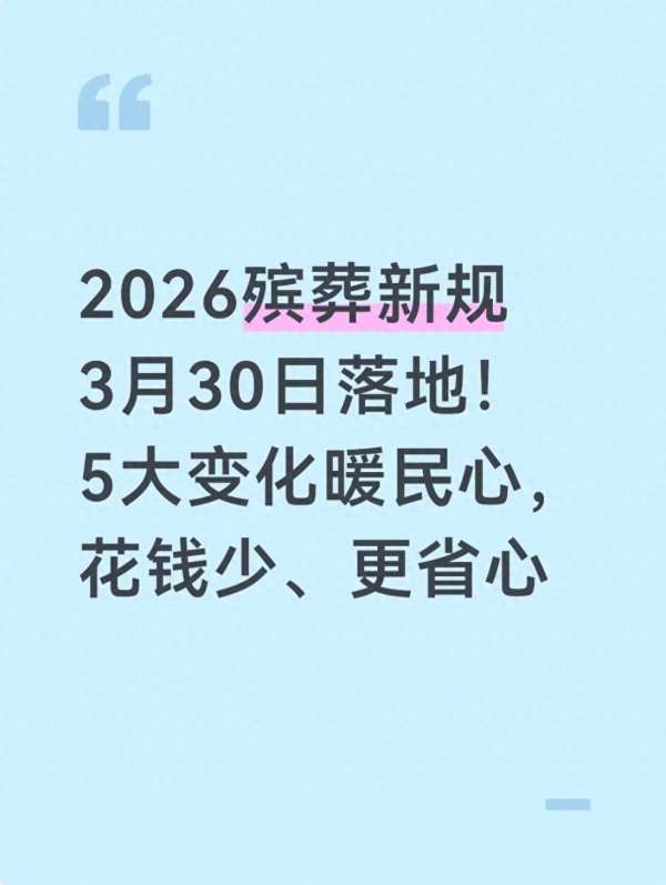 1月7日,国务院公布新修订的《殡葬管理条例》,3月30日起全国统一施行,这是近30年来第二次全面修订,73条新规直击"收费乱、跑腿多、安葬贵、监管弱、观念旧"五大痛点,让办丧事回归公益、省钱省心、流程顺畅。咱们用大白话把5大变化拆透,再给你一份实操指南,以后办丧事少踩坑、少花钱、少跑腿。