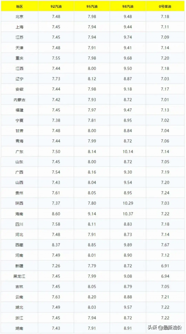 10月15日全国各省市汽油价格表: