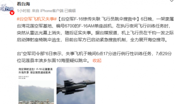 台媒"联合新闻网"1月6日报道,台空军司令部证实,一名辛姓飞行员在花莲基地驾驶一架F-16单座战机(机号6700)于18时17分起飞执行例行性训练任务。19时29分,这名飞行员于花莲县丰滨乡东面10海里处疑似跳伞。