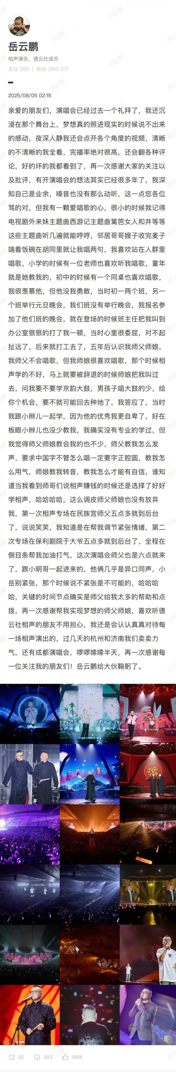 开演唱会被质疑,岳云鹏凌晨发文:深知自己是业余,但有一颗爱唱歌的心