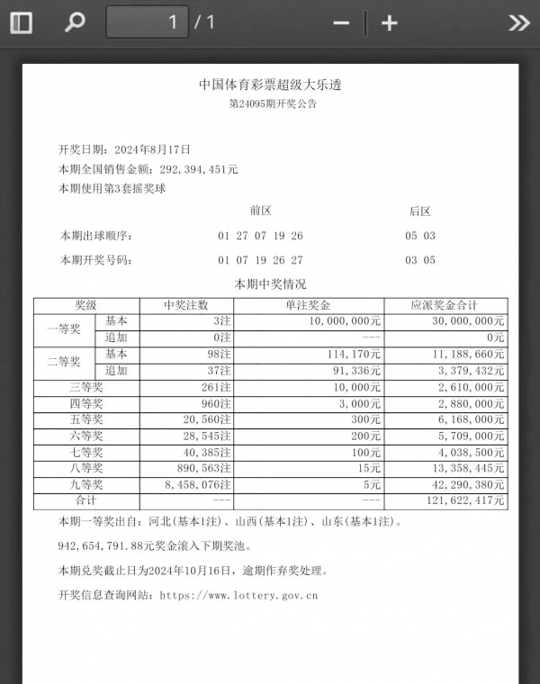 这组号码可不得了,直接让三位幸运儿成为了千万富翁!据悉,河北、山西和山东各中出一注1000万元的头奖。想象一下,这三位幸运儿昨天还是普通人,今天一觉醒来就成了千万富翁,这种感觉简直不要太爽!