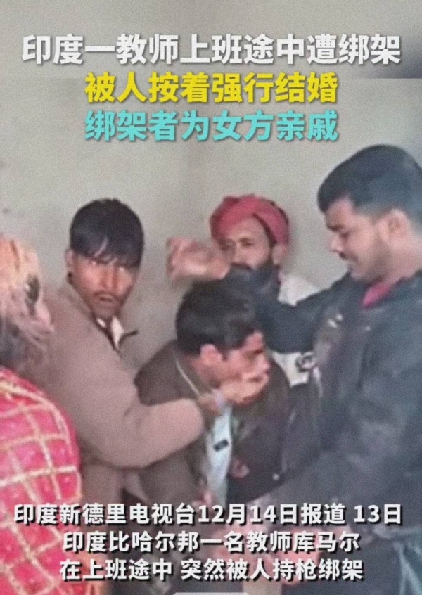 近日,印度比哈尔邦一名男教师在上班路上突然被绑架。十几名大汉将他绑到了一场婚礼上,殴打他、拿着枪恐吓他,强迫他与一名女子(这十几名大汉的亲戚)成婚。婚礼结束后男子逃脱报警,还说曾被这名女子跟踪骚扰;女子则坚称自己和这名男教师谈过4年恋爱。
