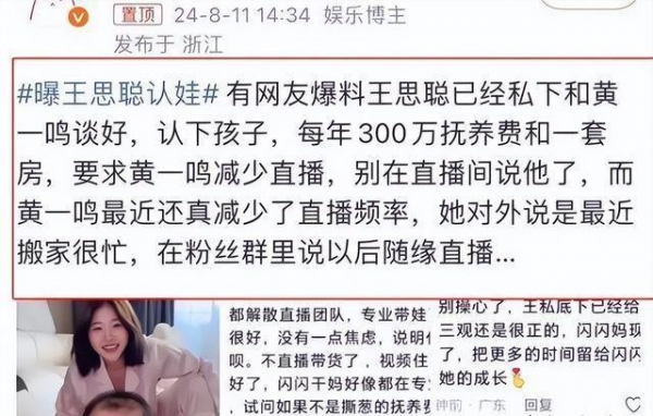 随着黄一鸣的直播回应,事态更是推向了高潮。在直播中,黄一鸣大方承认了王思聪给予的抚养费和房子,并表示"这事你不说,也是大家都知道的事!"