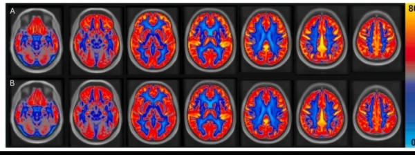 图:成人(n=31)在(A)花生干预和(B)无花生干预的平均脑血流量(CBF)图(论文截图)