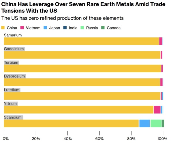 中美贸易摩擦背景下,中国掌握七种稀土金属的主导权,美国对这几种元素的精炼产能为零。(图表先后为钐、钆、铽、镝、镏、钇、钪)彭博社制图