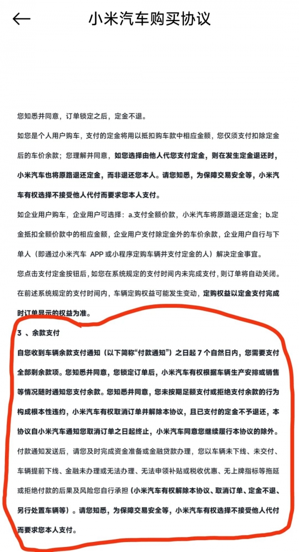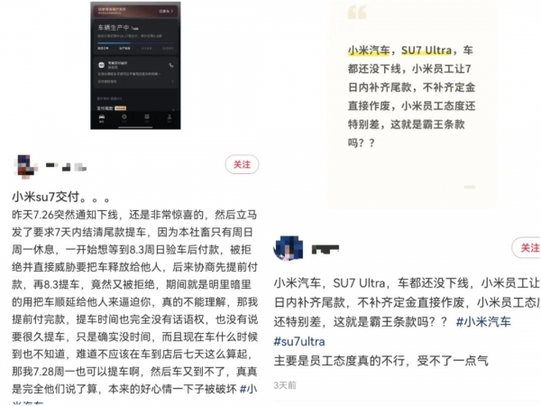 有用户表示,自己的订单因未在规定时间内支付尾款被标注为"违约",5000元定金面临被扣的风险;还有用户提到,小米汽车App显示车辆还有22周-25周交付,但销售就已发来尾款支付通知,明确告知逾期未付将被视为放弃订单。