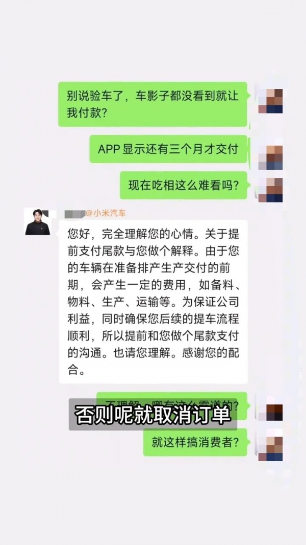 此前,据齐鲁壹点报道,一位杭州用户在2024年4月订购了小米SU7的某款车型,支付5000元定金后,原计划当年7月提车。然而,到了2024年12月,小米方面以"工厂备料需求"为由,要求该用户在7日内支付尾款,否则订单将作废。用户支付尾款后,却被告知需要重新排队,交付时间延长至2025年4月,较原计划推迟了9个月。最终,因未能及时提车,该用户的尾款被退回,订单状态反复变更,这让其对小米汽车的交付管理能力产生了严重不满。