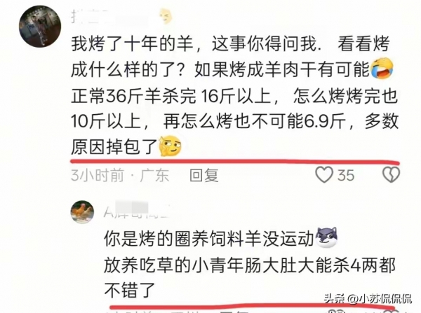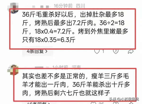 但这些说法在行业标准面前全都是站不住脚的谎言,在行业公认活羊宰杀去头、蹄、皮、内脏之后,筒体重量本应该是活重的40%到50%,也就是说36斤活羊算下来胴体至少也有15到18斤重。再经过高温烤制,脱水去油的损耗率约30%到40%,最终成品重量应该在10到13斤左右。