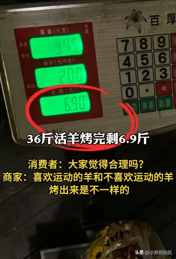 王女士不依不饶选择报警,民警到场之后,商家才极不情愿的配合复秤,6.9斤的数字一出来,全场哗然。更离谱的是商家面对质疑还在不断狡辩,先是拒称,后来又编造说去内脏剩40%,再烤又掉50%的说法,甚至还说羊的个体有差异,爱运动的羊会更瘦烤的干。