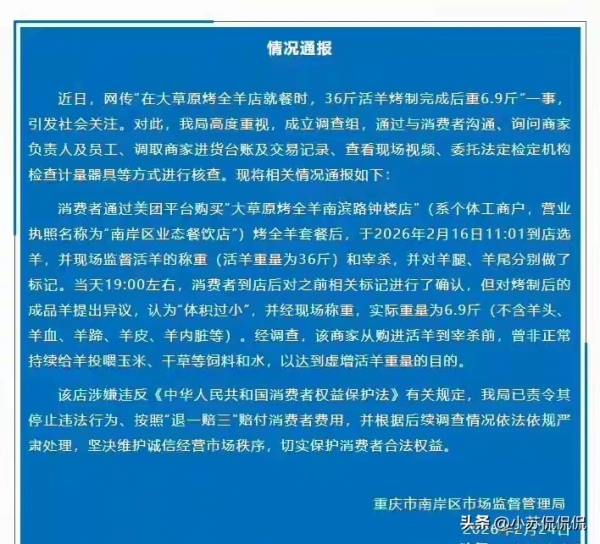 终于在2月24日等来了重庆市南岸区市场监督管理局发布通报,真相大白原来是商家提前给羊灌水喂料,故意虚增重量,纯属是消费欺诈。目前已责令商家退一赔三,并将依法从严处理,结果真是大快人心。