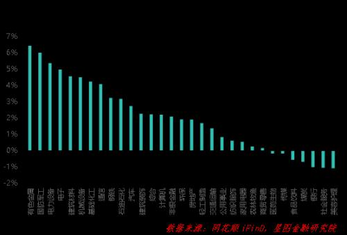 从申万一级行业来看,周内24个一级板块上涨,整体而言涨多跌少。涨幅靠前的聚集在有色金属、国防军工、电力设备等领域。主要是大宗商品价格剧烈上涨,以及资金热炒航空航天概念等等。跌幅较大的则包括美容护理、社会服务、银行等,主要还是前期顺周期传统行业行情的退潮与回调。更多数板块当周表现都要强于前周,18个板块涨幅扩大或者跌幅收窄。整体来看,当周行情不错。