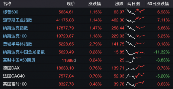 隔夜美股三大股指集体收涨,道琼斯工业平均指数上涨1.14%,纳斯达克综合指数上涨1.47%,标准普尔500指数上涨1.15%,反映了市场对降息预期的积极响应。