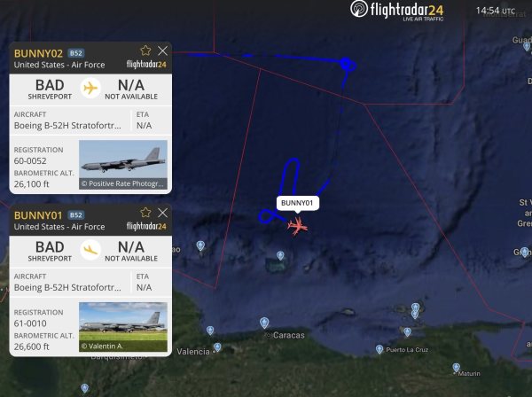 一些社交媒体上开源情报账户发布的推文显示,呼号分别为"BNUUY01"(兔子01)、"BUNNY02"(兔子02)和"BUNNY03"(兔子03)的3架B-52轰炸机于当地时间15日凌晨从路易斯安纳州巴克斯代尔空军基地向南起飞,随后向东飞往委内瑞拉近海的迈克蒂亚飞航情报区(Maiquetia FIR)内的一片"国际空域"。这些B-52在该飞航情报区内盘旋了约2小时后飞离,此外,最近几周内,可能是从波多黎各前罗斯福路海军舰队起飞的陆战队F-35B以及美国空军加油机和其他飞机也被观测到在附近空域活动。