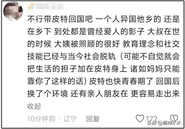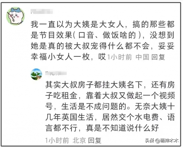 基思大叔离开之后,网友们都开始担心东北大姨后续的生活了,从他们日常相处模式看,大姨被大叔保护得太好了,缺乏独立生活的能力,大叔和大姨还是为了孩子上学近年才搬回了英国,大姨甚至连英语都不太流利,评论区已经有人开始劝大姨办完葬礼之后尽快回国。