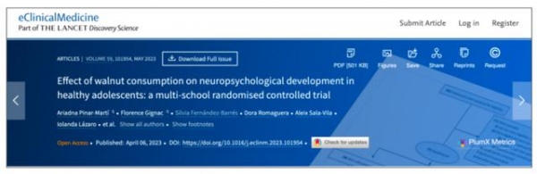2023年柳叶刀子刊《临床医学》(eClinicalMedicine)的一项研究,进行了为期6个月的随机对照营养干预试验,评估核桃是否会促进青少年的神经心理和行为发展。
