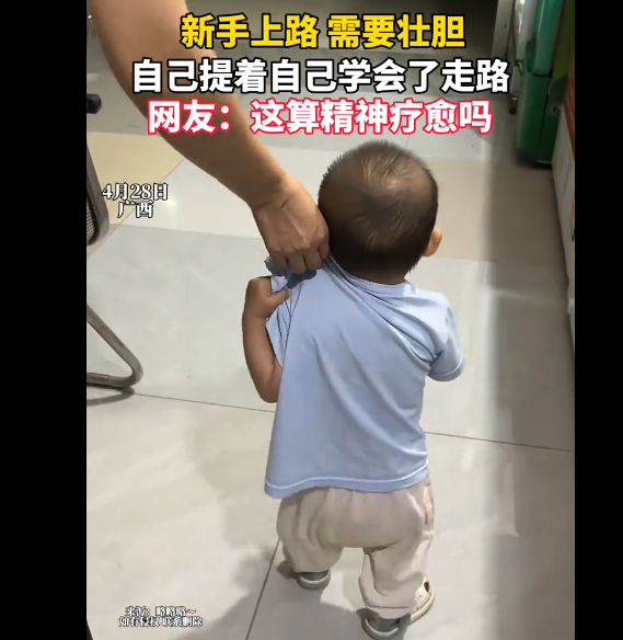 广西一位学步的小萌娃火了。视频里,他没有依赖大人搀扶,反而攥住自己的衣角,假装被牵着,一步一步稳稳地往前走。