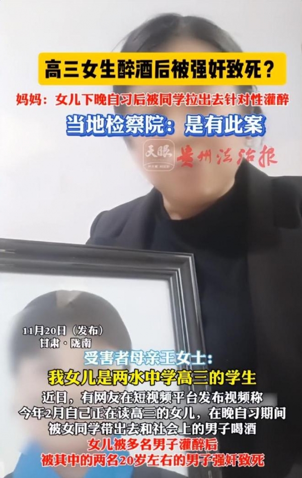 据王女士在短视频平台发布的视频透露,她的女儿小霞(化名)是甘肃省陇南市武都区两水中学的一名高三学生。今年2月29日晚自习期间,小霞的一名女同学因校外恋爱关系,被其男友邀请外出喝酒。但是一个人去没意思,这名女同学拉上了小霞一同前往。