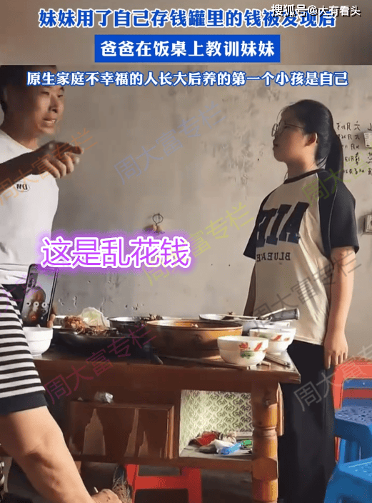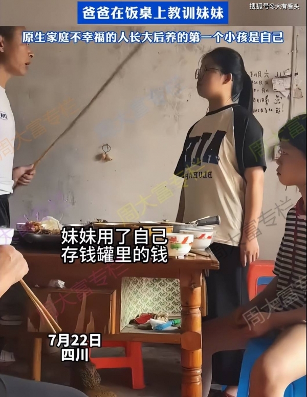 四川,有一名男子发了一段视频,视频中自己的父亲正拿着一根藤条教训妹妹,而父亲之所以大发雷霆,是因为妹妹把她自己存钱罐里的钱一下子全都花光了,父亲才会生气,所以就在饭桌上教训了妹妹