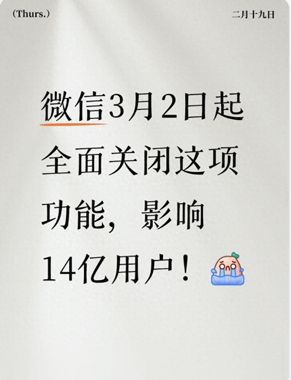 近期,"微信3月2日全面关闭功能、影响14亿用户"的消息在社交平台持续发酵,不少普通用户心生恐慌,担心日常聊天、支付、刷朋友圈等核心功能受影响,甚至出现盲目转发、过度焦虑的情况。为厘清事实、破除谣言,本文严格依据微信官方2026年1月7日发布的《关于公众平台助手小程序停服及替代方案的说明》,结合最新平台动态,用真实、严谨、通俗的语言,完整解读本次功能调整的核心内容、影响范围、替代方案及背后逻辑,全程无夸大、无造谣、无标题党,确保信息准确合规,为广大用户提供最权威的民生资讯参考。