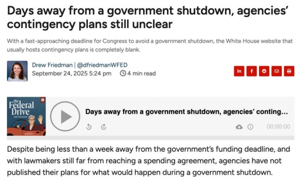 专门聚焦报道联邦政府管理与政策的美国媒体Federal News Network报道,尽管政府面临"停摆",但两党在主要问题上的分歧远未达成一致。