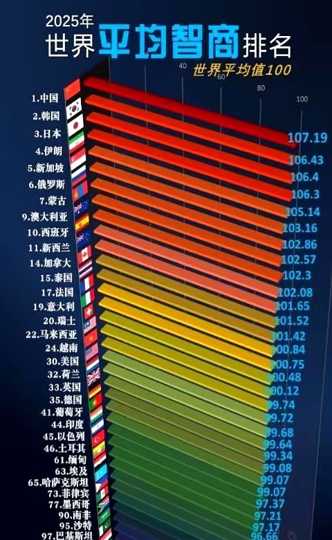 "聪明与否靠天生?" 别逗了!2025年全球智商排名一出炉,直接颠覆认知--中国人均智商107.43稳坐世界第一,俄罗斯103.16紧随其后,而科技巨头美国居然只有99.74,连世界平均值100都没跨过,排在第三十位!这三国的智商差距,到底是巧合还是早有伏笔?