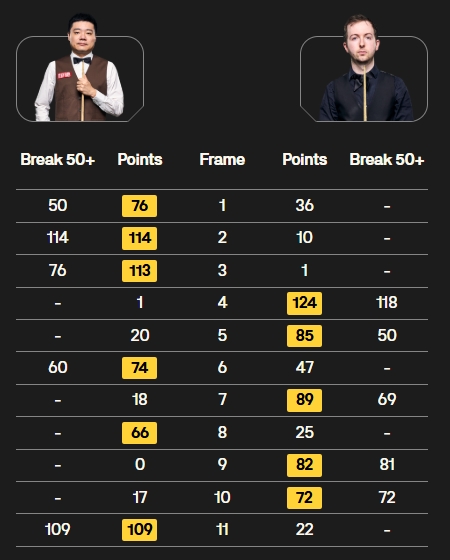 整场比赛双方比分紧咬。丁俊晖在上半场取得3-1领先后,唐纳森在下半场一度将比分追平。关键决胜局中,丁俊晖打出单杆109分,最终锁定胜利。