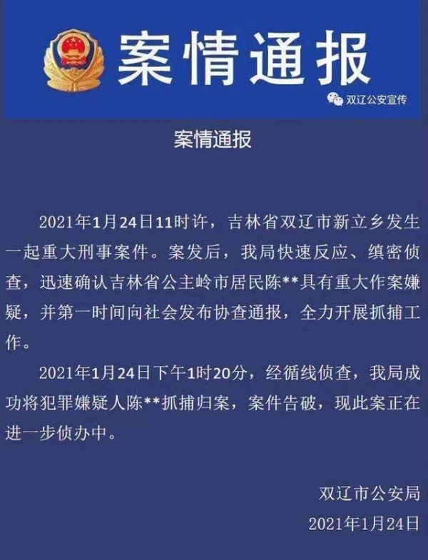 与此同时,1月25日下午,记者与双辽市新立乡派出所取得联系,一名值班人员回应称,目前此案正在接受进一步调查,具体案情并不方便透露。