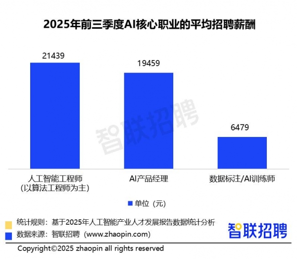 智联招聘发布的《2025年人工智能产业人才发展报告》显示,在三大AI核心岗位中,人工智能工程师(以算法工程师为主)的平均招聘月薪最高,为21439元;其次,AI产品经理平均月薪达19459元;而数据标注/AI训练师的平均薪酬则仅为6479元。