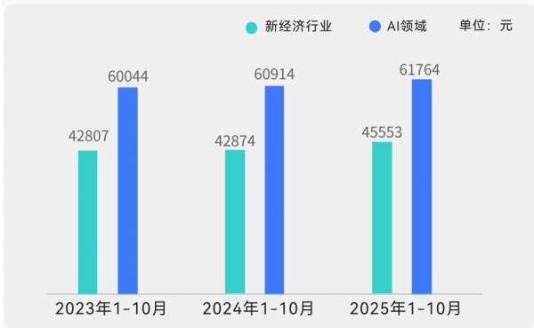 根据脉脉最新发布的《2025年度人才迁徙报告》,2025年1至10月,AI领域新发岗位的平均月薪为61764元,较新经济行业(即利用互联网、大数据、云计算、人工智能等技术,诞生出新产品、新业态、新商业模式的行业)整体薪资45553元高出35.59%,而某些传统行业从业者更是要半年或者更长时间才能抵得上AI人才干一个月。