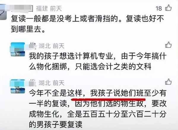本以为选择物生政或物生地,能获得更多卷面分,比物化生、物化政等选科更有优势,结果连报考的机会都没有。这些学生不仅选择了复读,还更改了选科方案,即便化学成绩不理想也要坚持物化必选,即便化学拿0分,加权后的成绩也比物生政有优势。