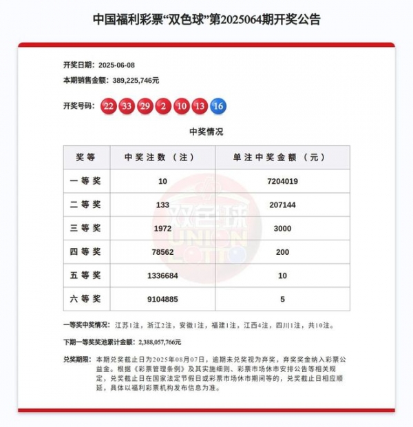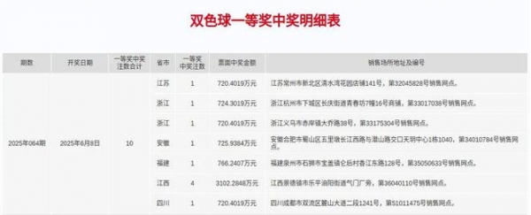6月8日,一位常州购彩者喜中1注福彩双色球一等奖,合计揽获奖金720余万元。