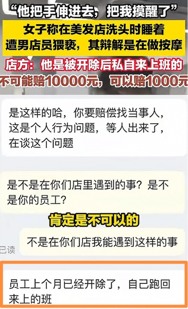 近日,武汉椰岛美发店发生的一起店员猥亵女顾客事件引发广泛关注。事件中,女顾客王丽(化名)在洗发时睡着,却被店员触摸胸部惊醒,店员辩称是在做肩颈按摩。经警方检测,在王丽胸部皮肤组织检测出涉事男子生物信息,该男子被处以10日行政拘留。而涉事门店店长称,涉事员工因旷工已被开除,是私自回店上班 。这一回应看似撇清了店铺责任,实则疑点重重。