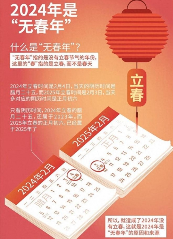 实际上,无春年的说法并不是空穴来风,根据农历和阳历的换算关系,2024年的农历是没有立春这个节气的,因此可以被称作无春年,但是,从科学的角度来看,无春年并不会对人们的生产生活造成太大的影响,虽然民间流传着许多关于无春年的说法,但这些都是基于传统文化的背景和人们的经验总结而来的,并不具有科学依据。