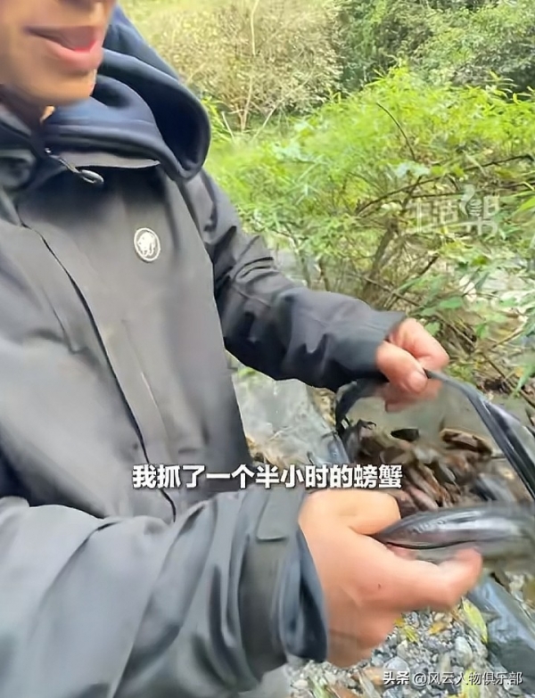 只见林北在小溪沟里搬石头砸石头抓鱼,林北向拍摄者展示自己的成果说道:"给大家看一下,我抓了一个半小时的螃蟹,刚才数了一下共有四十八九只,根本吃不完。"