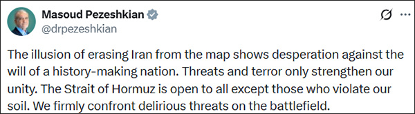 在美国总统特朗普声称已经将伊朗从地图上抹去后,当地时间3月22日,伊朗总统佩泽希齐扬在社交平台发文称,"将伊朗从地图上抹去的幻想,体现了面对一个创造历史的民族的意志时所流露的绝望。威胁和恐怖只会进一步增强我们的团结。"